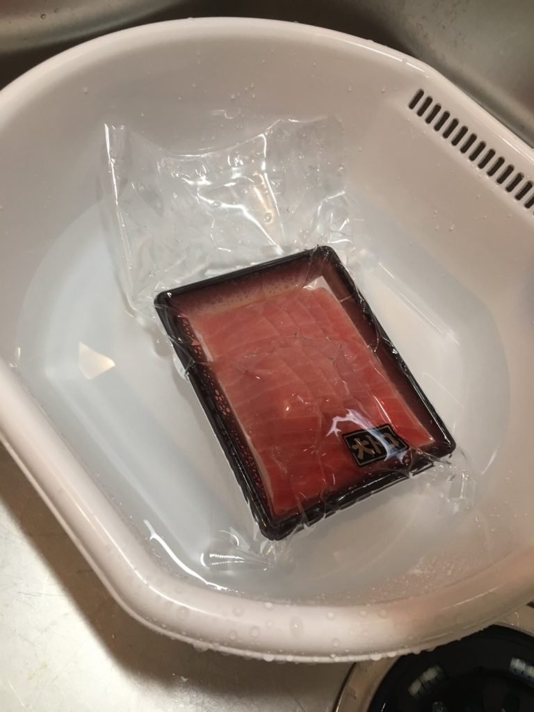 脱気包装タイプは流水で10分程度で解凍できますので「刺身でコレだけ食べる」お客様はこちらのやり方も可能です。