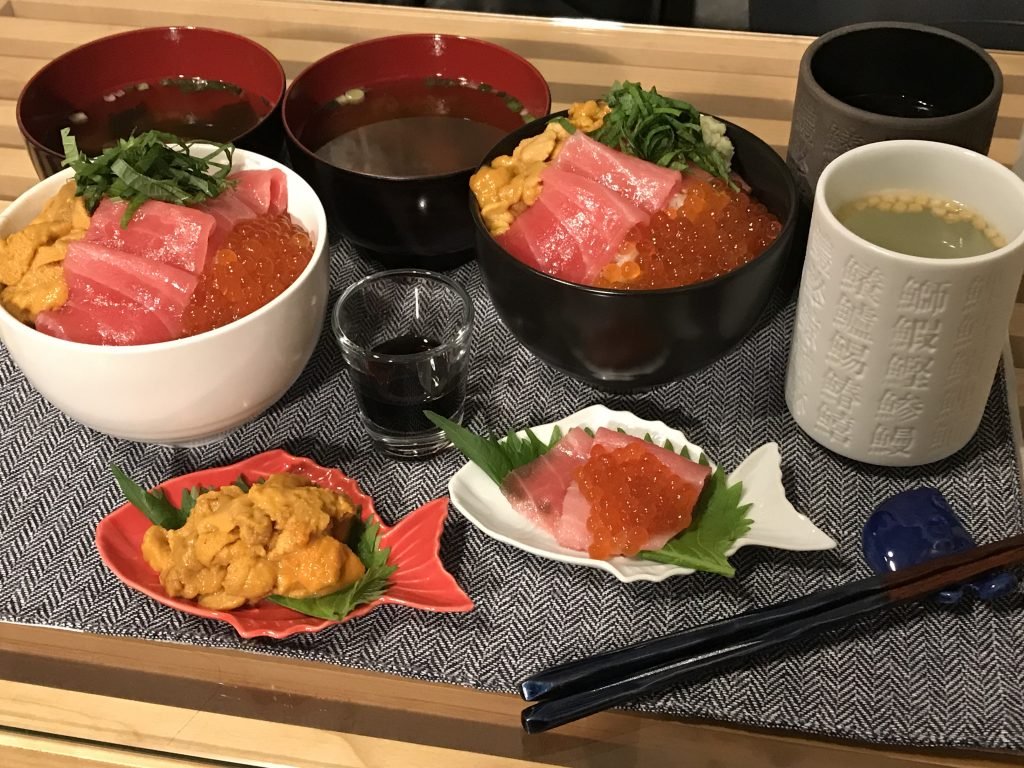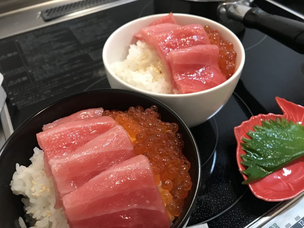 今回は2つに分けて てんこ盛りに作り、それでも余ったので小皿に大トロといくら、ウニを盛り付けてみました。
