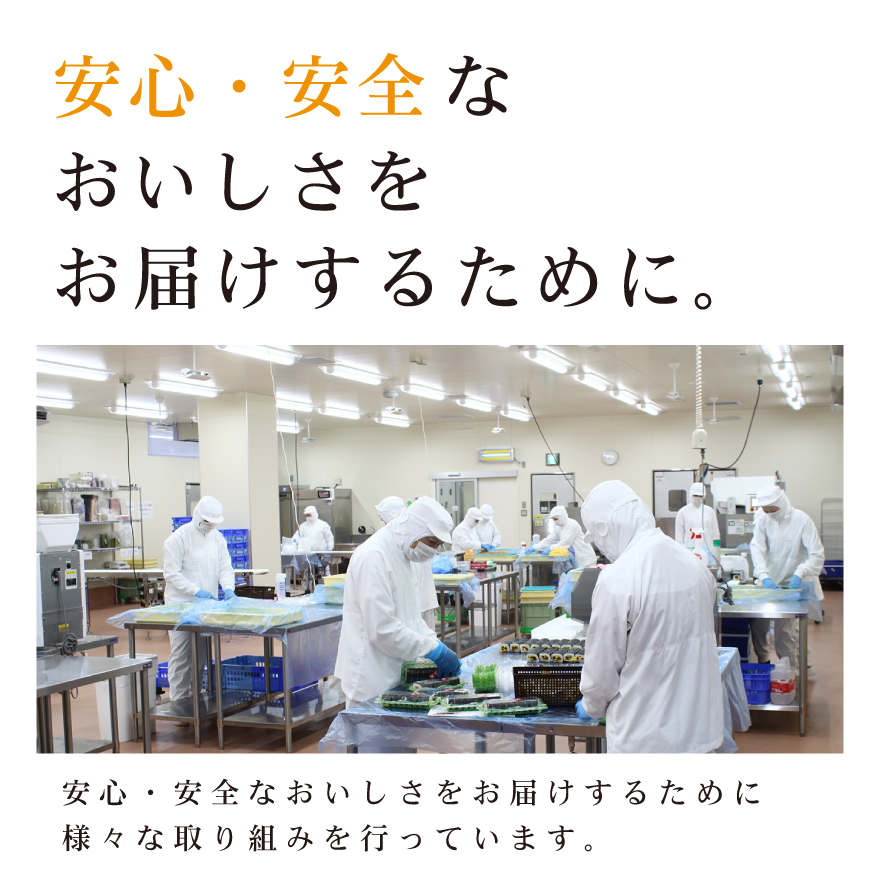 衛生管理の徹底と危害リスク低減に取り組んでおります。工場入室時には、手洗い後のエアシャワー、粘着ローラー掛けによって着衣の異物、毛髪除去を行い、アルコール消毒をして入室しております。 高感度金属探知機等による製品チェックに加えて、本社スタッフがひとつひとつの製品を目視で点検。 全世界170ヶ国以上で信頼されている国際的な品質管理規格ISO9001を取得。安心安全は私たちがもっとも大切にしていることの一つです。おいしさと同じくらい、そして安全を当たり前にするためにそれ以上に取り組んでいます。