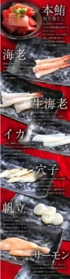 栄養成分表示推定値 (100gあたり) 【生海老】:●エネルギー:82kcal ●たんぱく質:19.6g ●脂質:0.6g ●炭水化物:0.7g ●食塩相当量:0.3g・【海老】:●エネルギー:82kcal ●たんぱく質:19.6g ●脂質:0.6g ●炭水化物:0.7g ●食塩相当量:0.3g・【サーモンスライス】:●エネルギー:237kcal ●たんぱく質:20.1g ●脂質:16.1g ●炭水化物:0.1g ●食塩相当量:0.1g・【ほたて貝】:●エネルギー:79kcal ●たんぱく質:14.8g ●脂質:0.9g ●炭水化物:1.6g ●食塩相当量:0.8g・【冷凍ゆでたこ】:●エネルギー:99kcal ●たんぱく質:21.7g ●脂質:0.7g ●炭水化物:0.1g ●食塩相当量:0.1g・【アカイカ】:●エネルギー:89kcal ●たんぱく質:40.2g ●脂質:3.1g ●炭水化物:0g ●食塩相当量:1.1g・【釜煮込み真穴子】:●エネルギー:198kcal ●たんぱく質:16.1g ●脂質:11.5g ●炭水化物:5.3g ●食塩相当量:1.1g・【真鯛】:●エネルギー:142kcal ●たんぱく質:20.6g ●脂質:5.8g ●炭水化物:0.1g ●食塩相当量:0.2g・【いくら】:●エネルギー:228kcal ●たんぱく質:22.3g ●脂質:6.7g ●炭水化物:12.4g ●食塩相当量:2.0g ・【本マグロ切落し】:●エネルギー:130kcal ●たんぱく質:25.4g ●脂質:2.3g ●炭水化物:0.3g ●食塩相当量:0.1g