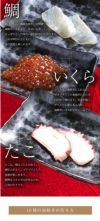 商品内容 生海老4貫・海老4貫・サーモンスライス4貫・ほたて貝4貫・冷凍ゆでたこ4貫・アカイカ4貫・釜煮込み真穴子4貫・真鯛4貫・いくら・本マグロ切落し