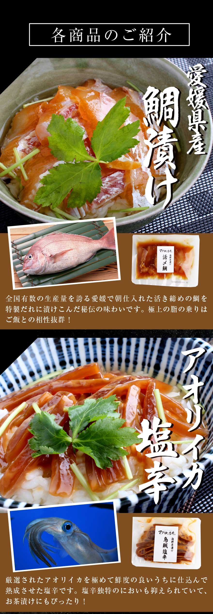産地・原料 【鯛漬け】鯛 (国内産)、濃口醤油、合成酒、みりん、ごま、昆布/調味料(アミノ酸等)、(一部に大豆・小麦・ごまを含む)