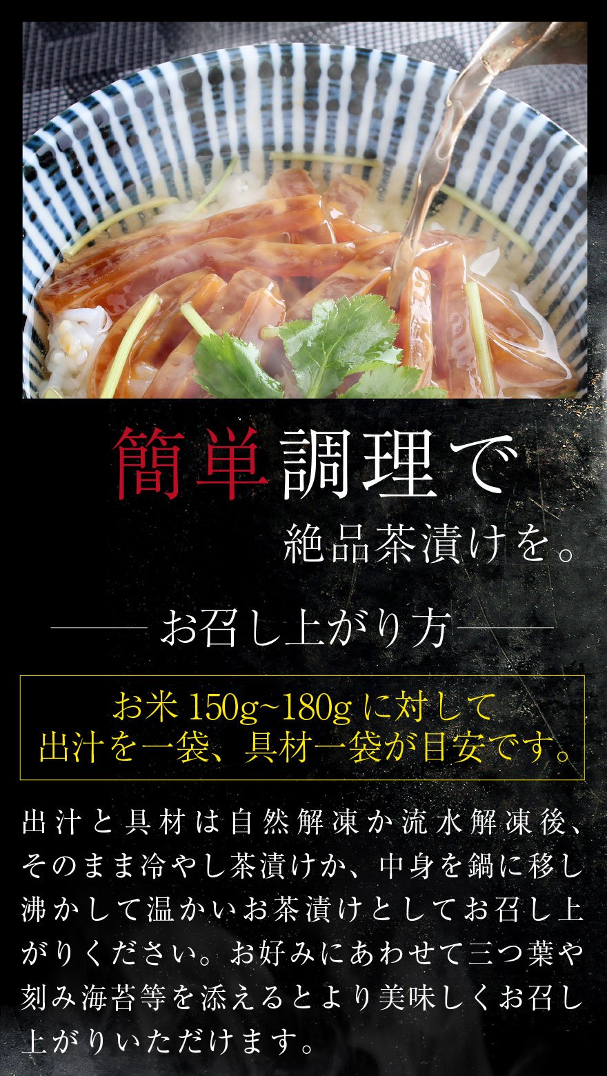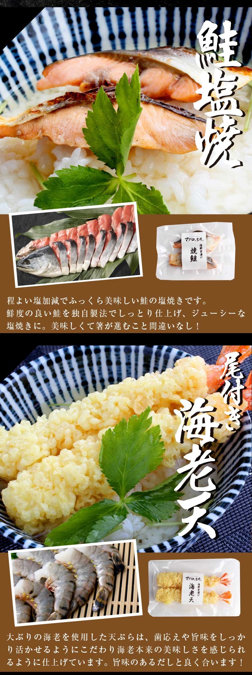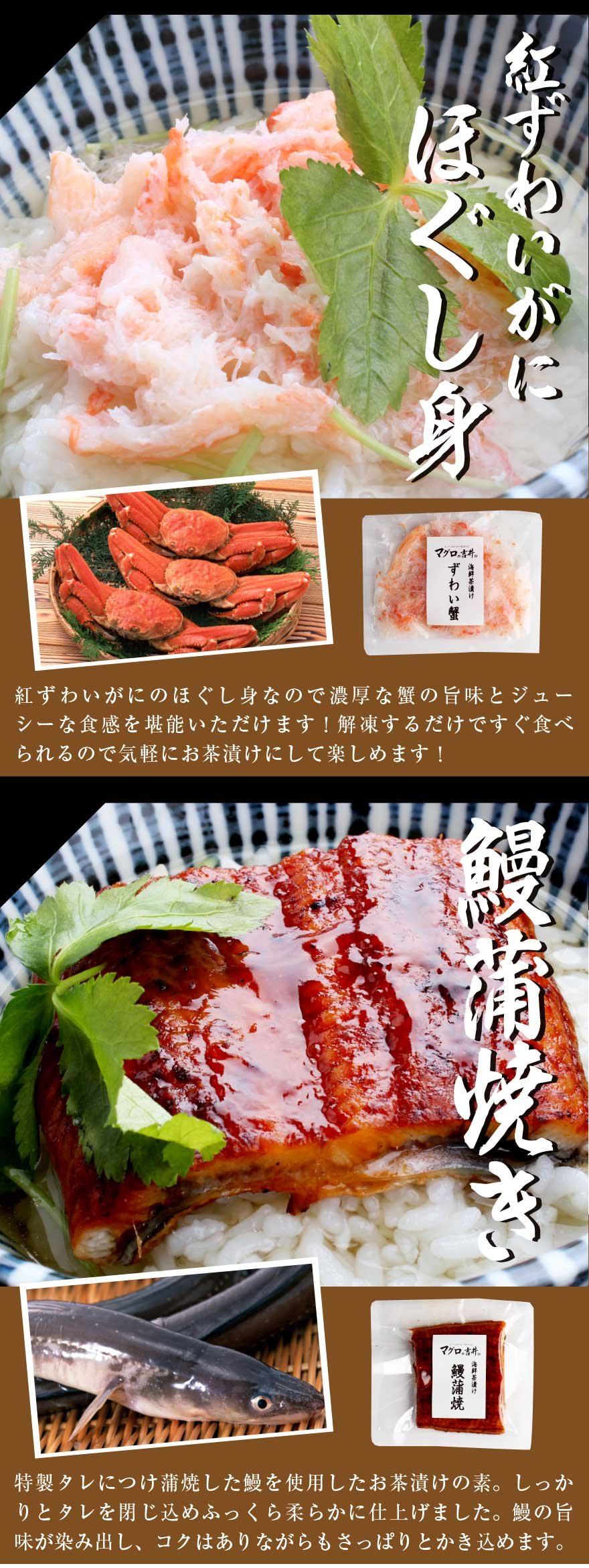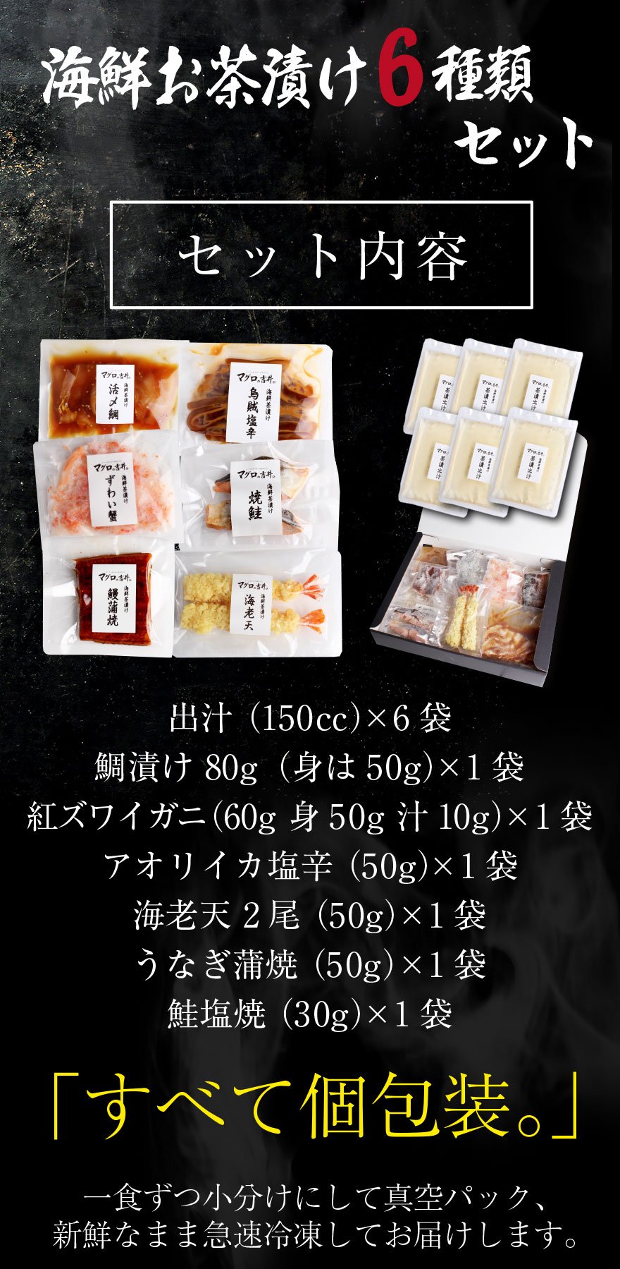 商品内容 鯛漬け(80g)×1袋、紅ズワイガニ(60g)×1袋、アオリイカ塩辛(50g)×1袋、海老天(2尾)×1袋、うなぎ蒲焼(50g)×1袋、鮭塩焼き(30g)×1袋、出汁(150cc)×6袋