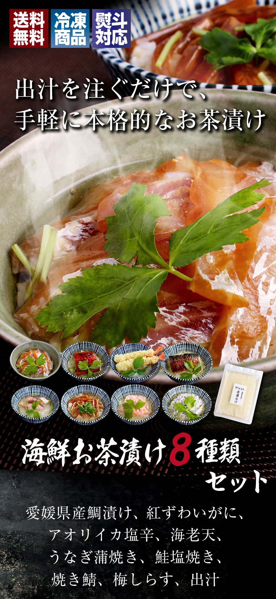 商品内容 鯛漬け(80g)×1袋、紅ズワイガニ(60g)×1袋、アオリイカ塩辛(50g)×1袋、海老天(2尾)×1袋、うなぎ蒲焼(50g)×1袋、鮭塩焼き(30g)×1袋、焼きサバ(50g)×1袋、梅シラス(60g)×1袋、出汁(150cc)×8袋