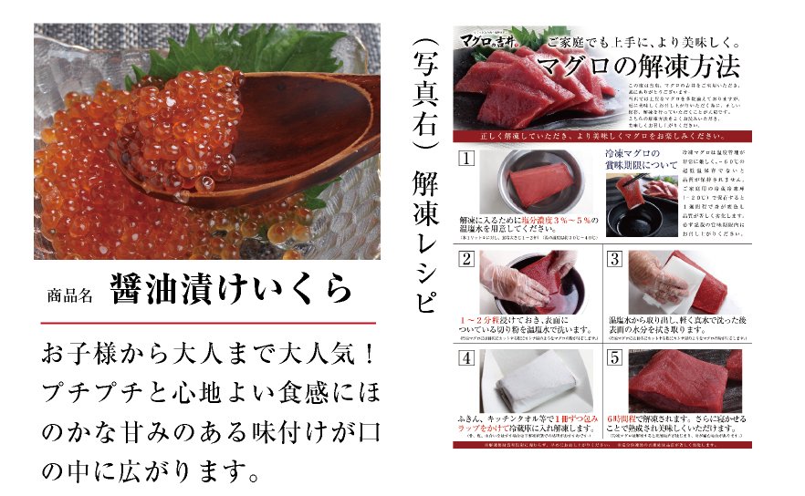 本鮪漬けセット 本鮪漬け160g、 メバチ鮪切落し 100g、 醤油漬けいくら 70g