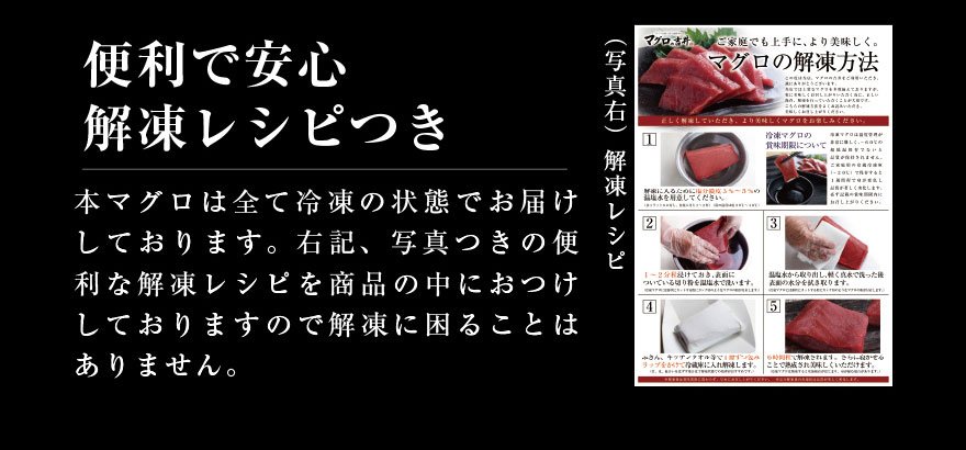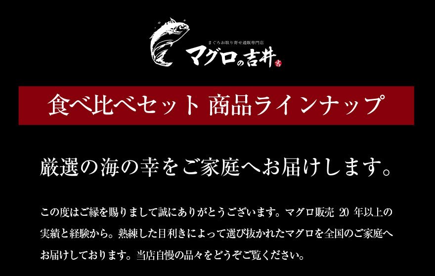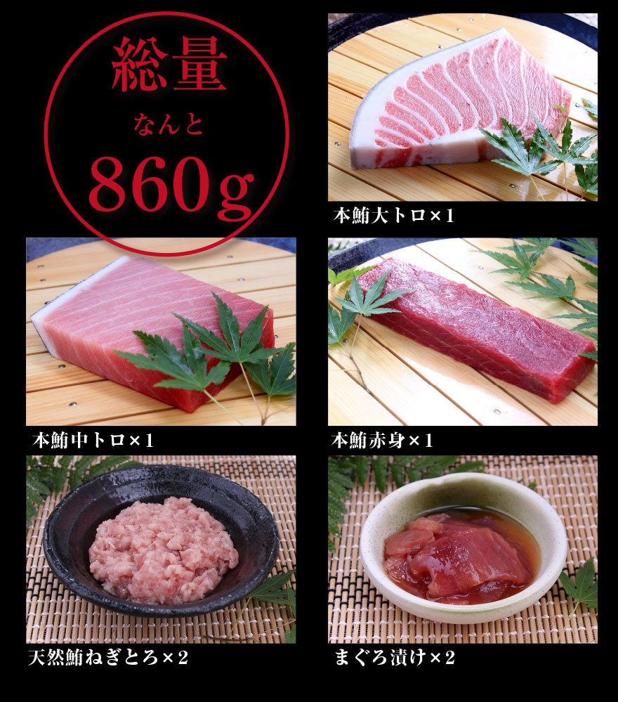 商品内容 本鮪大トロ柵約200g×1、本鮪中トロ柵約150g×1、本鮪赤身柵約150g×1、鮪たたき(ねぎとろ)100g×2、マグロ漬け80g×2