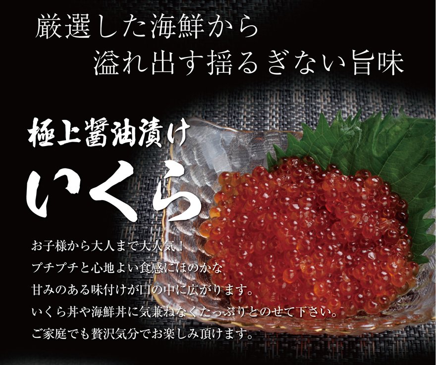【醤油漬けいくら】:鱒卵(アメリカ産)、粉末水飴、食塩、醤油、本みりん、発酵調味料、リンゴ酢、砂糖、カツオエキス、昆布エキス、たん白加水分解物、チキンエキス、調味料(アミノ酸等)、甘味料(ソルビトール)、増粘多糖類、(原材料の一部に小麦、いくら、大豆、鶏肉、りんごを含む)
