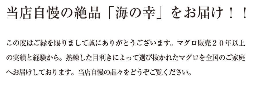 非会員で二回、会員で二回注文をしましたが、大変美味しく頂いています。 今までは近くのスーパーで購入していましたが、マグロの吉井さんを知ってからは味の虜になりました。 これからも宜しくお願いします。