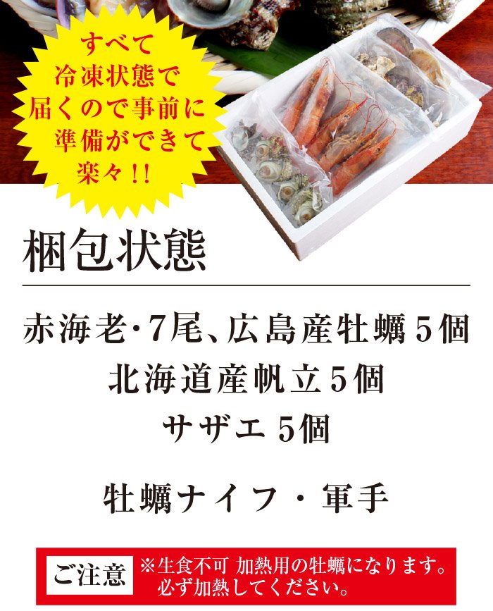 商品内容 赤海老・5尾、牡蠣・5個、帆立 5個、サザエ5個