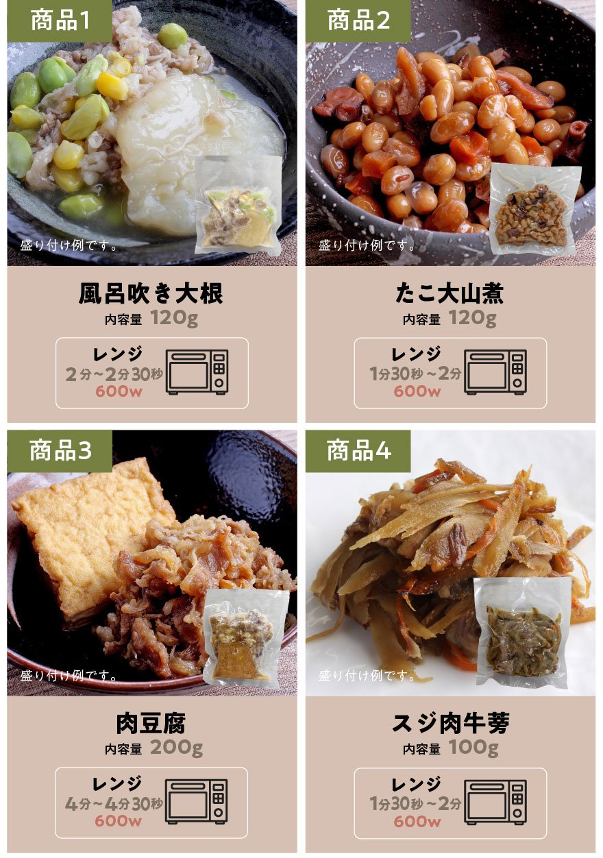 内容量 風呂吹き大根120g、たこ大山煮120g、肉豆腐200g、スジ肉牛蒡100g、いわしの蒲焼き2枚、